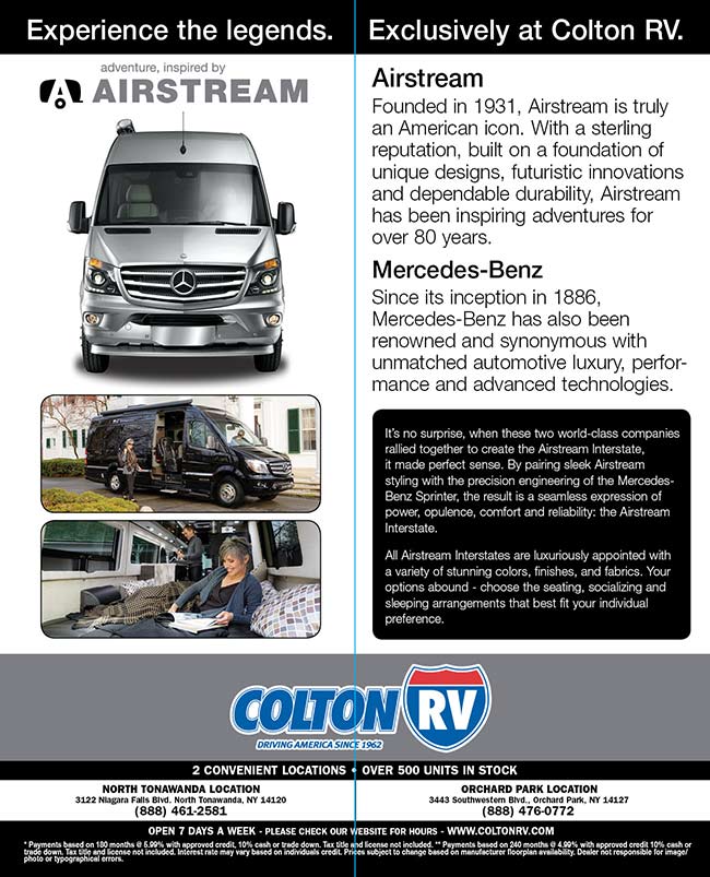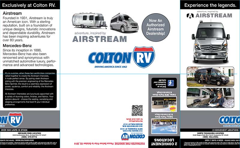 Gatefold Direct Mail piece promoting Colton RV's exclusive relationship with Airstream, the only dealer in WNY authorized to sell the classic Airstream brand.
