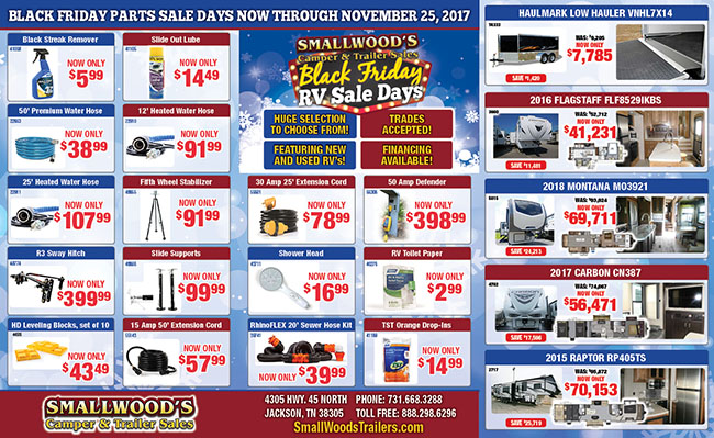 Tri-Fold Direct Mail piece promoting a Tennessee RV Company, Smallwood's Camper & Trailer Sales.