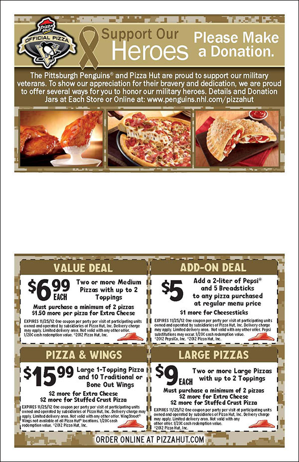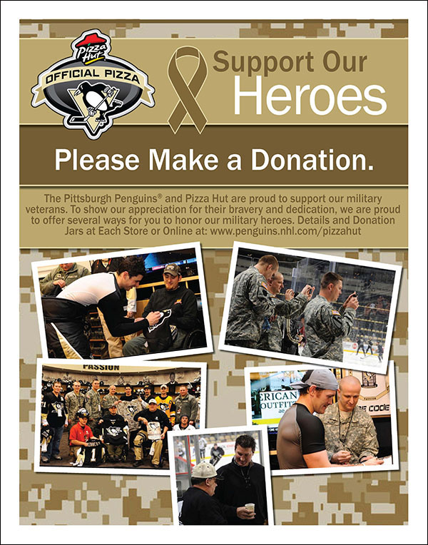Pizza Hut Pittsburgh Penguins "Support Our Heroes" Campaign In-Store Poster and Box-Topper for inclusion in Pittsburgh Area Pizza Hut stores and delivery boxes.